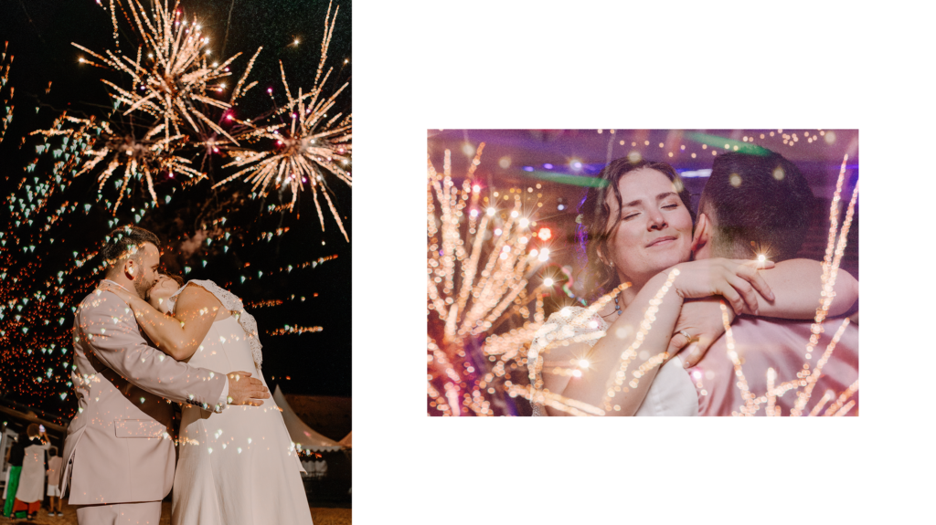 - Les fontaines de champagne, les cascades de coupes sous le saule illuminé, les feux d’artifice avec artificier professionnel, les lancers de bouquet au ruban, les flash mobs improvisées, les serviettes brodées une à une par la mariée pour ses invités, les petites attentions qui font toute la différence.
