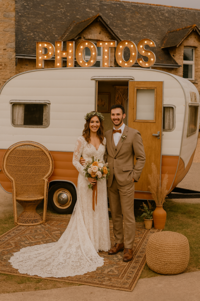 La grande nouveauté de cette nouvelle saison, c’est notre caravane au style vintage-bohème transformée en photobooth. Plus qu’un simple coin photo, c’est un véritable décor à part entière : on y entre, on rit, on se prend en photo, on enregistre un message… et on repart avec des souvenirs aussi tendres que décalés.