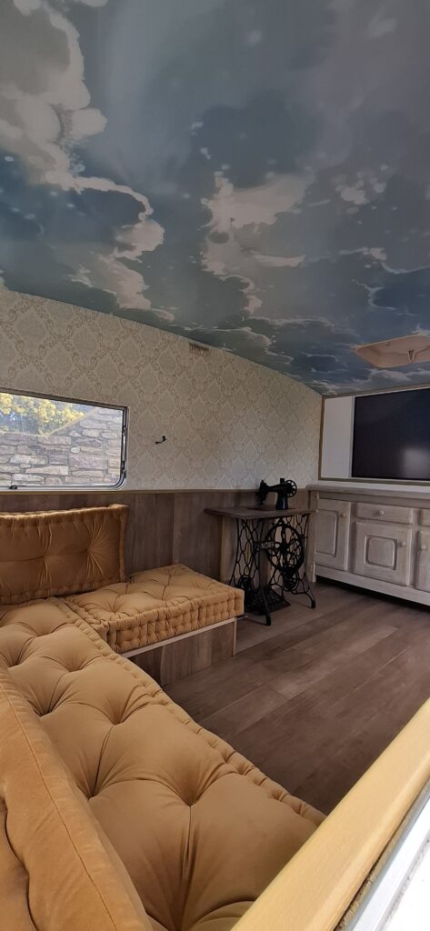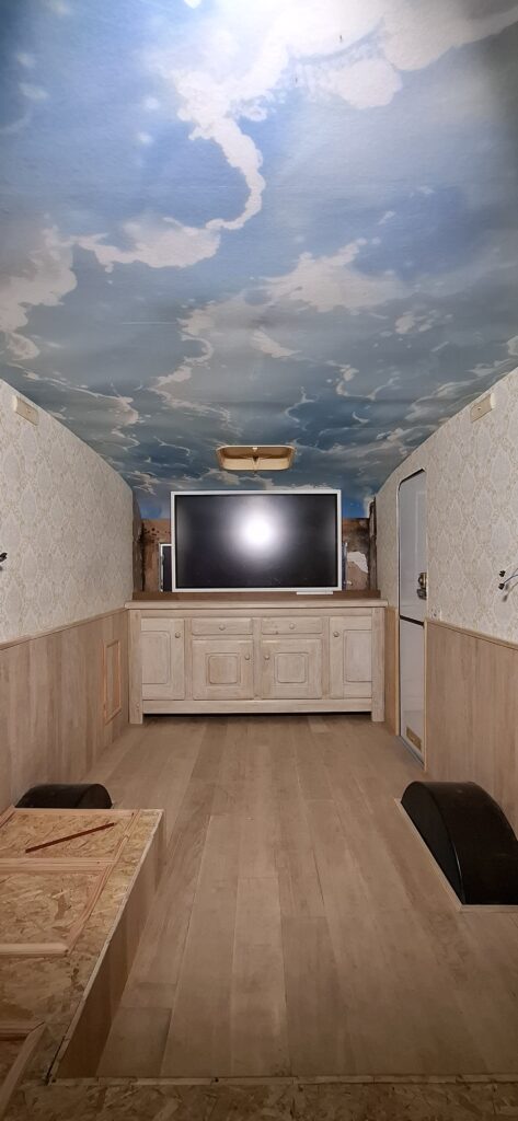 Le beige, le Autre belle nouveauté en préparation : la caravane photobooth sera, elle aussi, prête d’ici la fin du mois. Après l’avoir entièrement vidée, poncée, tapissée, aménagée, etc, il ne lui restait plus qu’à partir dans une société qui s’occupera de la floquer sur tout son contour extérieur.